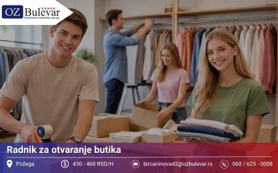 | 20.03.2026 Studentski posao - Radnik za otvaranje butika | Omladinska zadruga Bulevar Omladinska i studentska zadruga Bulevar vam nudi posao: Posao za studente na poziciji: Radnik za otvaranje butika Mesto: Požega Opis posla: Fizička ... | PrijavaKomentar | |