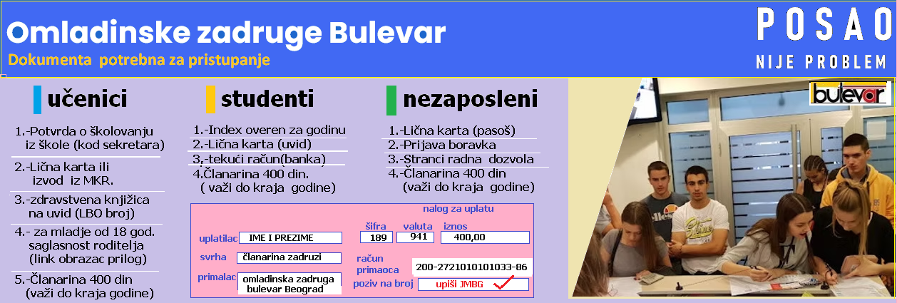 Na ovoj strani možete pronaći obrazac ili informaciju koje se uobičajeno koriste u poslovanju omladinske zadruge.Kada popunite traženi obrazac možete ga proslediti na našu e-mail adresu: office@ozbulevar.rs Direkcija bircaninova42@ozbulevar.rs stručna služba k.zorke5@ozbulevar.rs poslovnica Vračar studentskiservis@ozbulevar.rs poslovnica Novi Bg.
